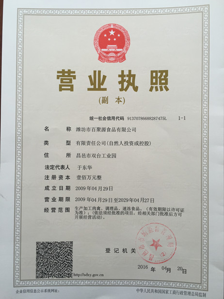 濰坊市百聚源食品有限公司成立于2009年7月份,現(xiàn)位于山東省昌邑市雙臺工業(yè)園。本公司是一家專業(yè)研究、開發(fā)、生產(chǎn)及銷售調(diào)理食品的企業(yè),主要產(chǎn)品面向全國市場,主要市場有北京、上海、福建、江蘇、廣東、湖北等大型城市的學(xué)校、中級西式餐廳、大中型商超及行政事業(yè)單位及企業(yè)的配餐供應(yīng)。公司引進(jìn)了國內(nèi)的生產(chǎn)技術(shù)和設(shè)備,年深化加工能力10000噸肉禽產(chǎn)品,將禽肉產(chǎn)品調(diào)理深化加工后,成為可以直接面對消費者的高端產(chǎn)品。產(chǎn)品在國內(nèi)食品行業(yè)內(nèi)具有較高水平。公司于2009年取得全國工業(yè)產(chǎn)品生產(chǎn)許可證,于同年取得清真食品生產(chǎn)經(jīng)營資格。于2011年五月份被昌邑市政府評為“2010年度食品安全生產(chǎn)先進(jìn)經(jīng)營單位”。2018年被市政府評為“昌邑市標(biāo)桿企業(yè)”